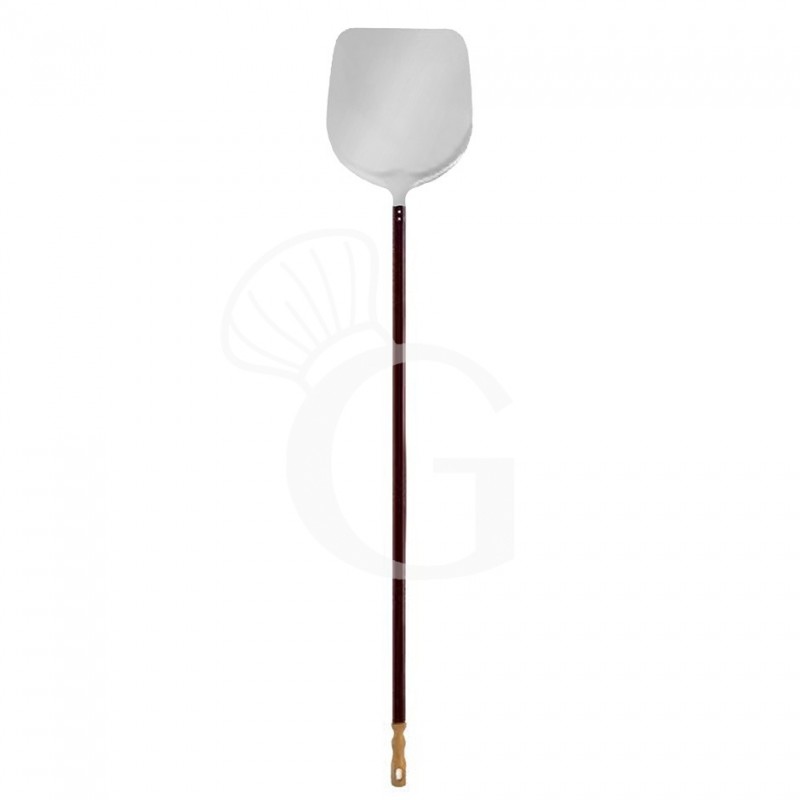 Die Pizzaschaufel ist aus einer eloxierten Aluminiumlegierung und hat einen ovalen ergonomischen Holzgriff.