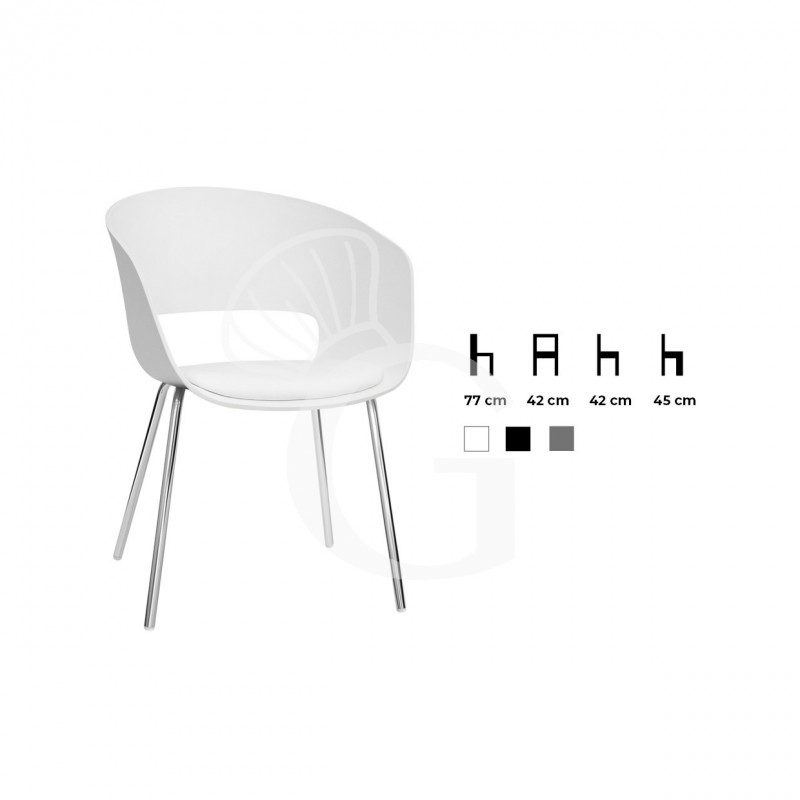 Der Sessel, Modell "ECO", besitzt verchromte Metallbeine, eine Sitzfläche aus Polypropylen, und ein bequemes Sitzkissen aus Kunstleder.