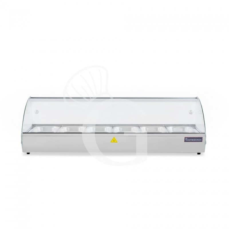 Die robuste Wärmevitrine ist aus Edelstahl und Glas. Sie besitzt eine gewölbte Frontscheibe und Schiebtüren auf der Rückseite.
