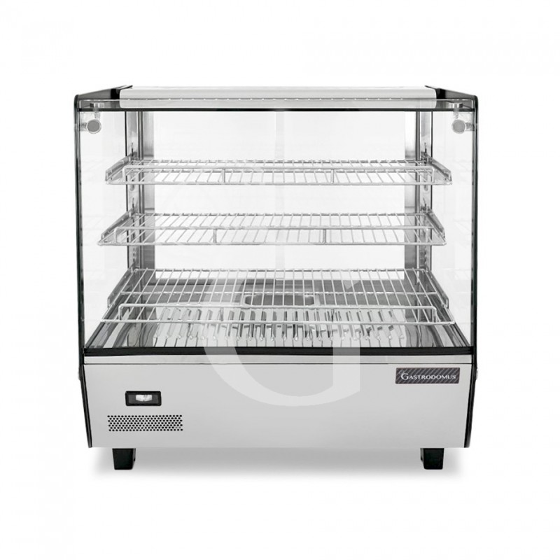 Die Wärmevitrine ist aus Edelstahl und Metall und besitzt 4 Seitenwände aus Glas und leicht zu reinigende Schiebetüren auf der Rückseite.