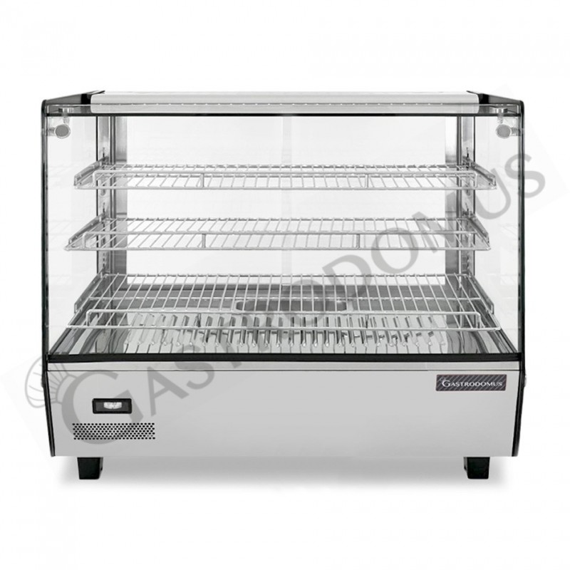 Die Wärmevitrine ist aus Edelstahl und Metall und besitzt 4 Seitenwände aus Glas und leicht zu reinigende Schiebetüren auf der Rückseite.