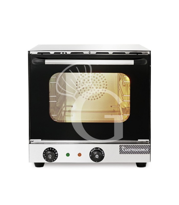 Der Heißluftofen aus Edelstahl AISI201 besitzt eine Klapptür mit einem praktischen Griff. Er ist für 3 Backbleche aus Edelstahl AISI430 geeignet.