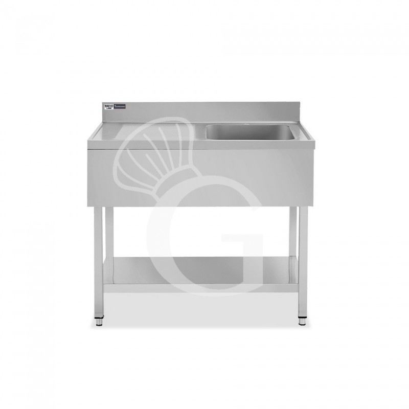 Der Spültisch hat eine Aufkantung auf der Rückseite, ein nahtlos eingeschweißtes Becken und eine Abtropffläche auf der linken Seite.