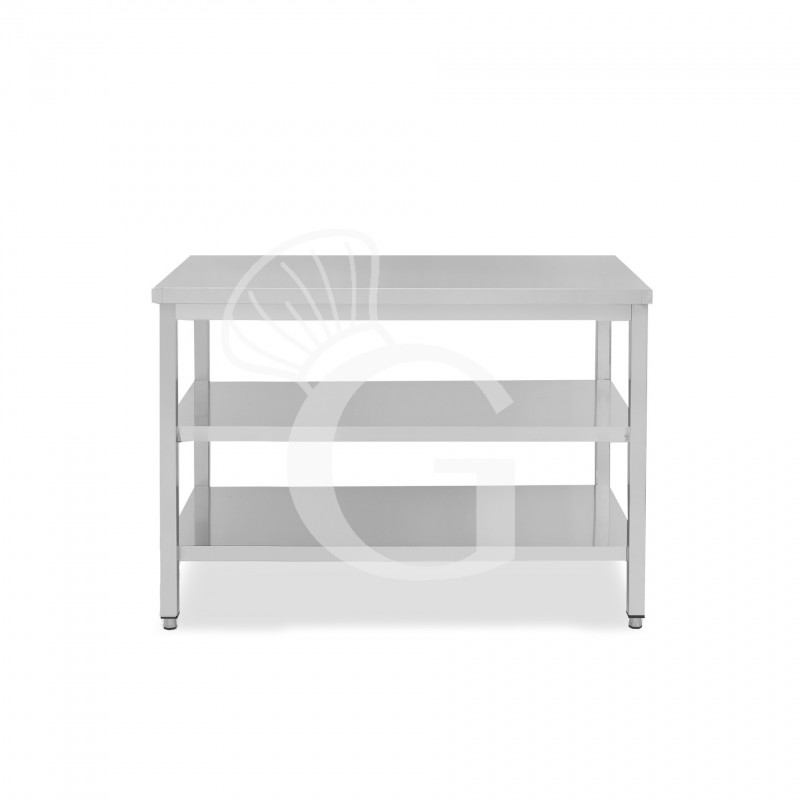 Tavolo semplice in acciaio inox con 2 ripiani e lunghezza 1200 mm x profondità 800 mm x altezza 850 mm.
