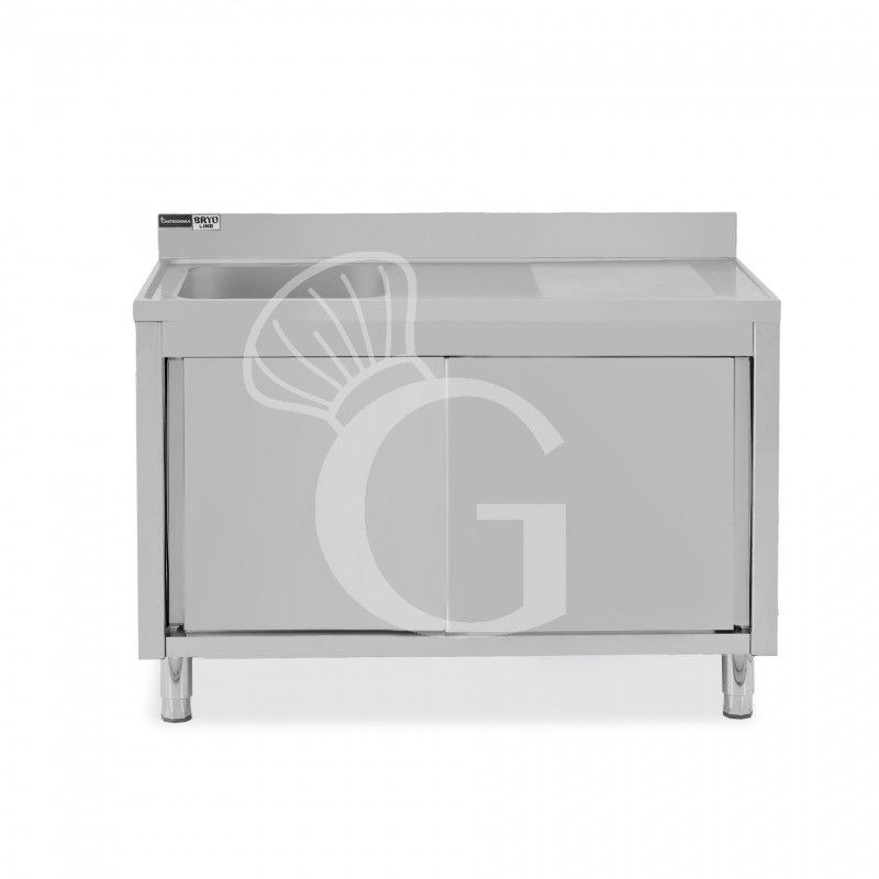 Spülschrank, Edelstahl, Schiebetüren, 1 Becken, Abtropffläche rechts, Aufkantung, Hahnloch Ø 32 mm, B 1400 x T 600 x H 965 mm
