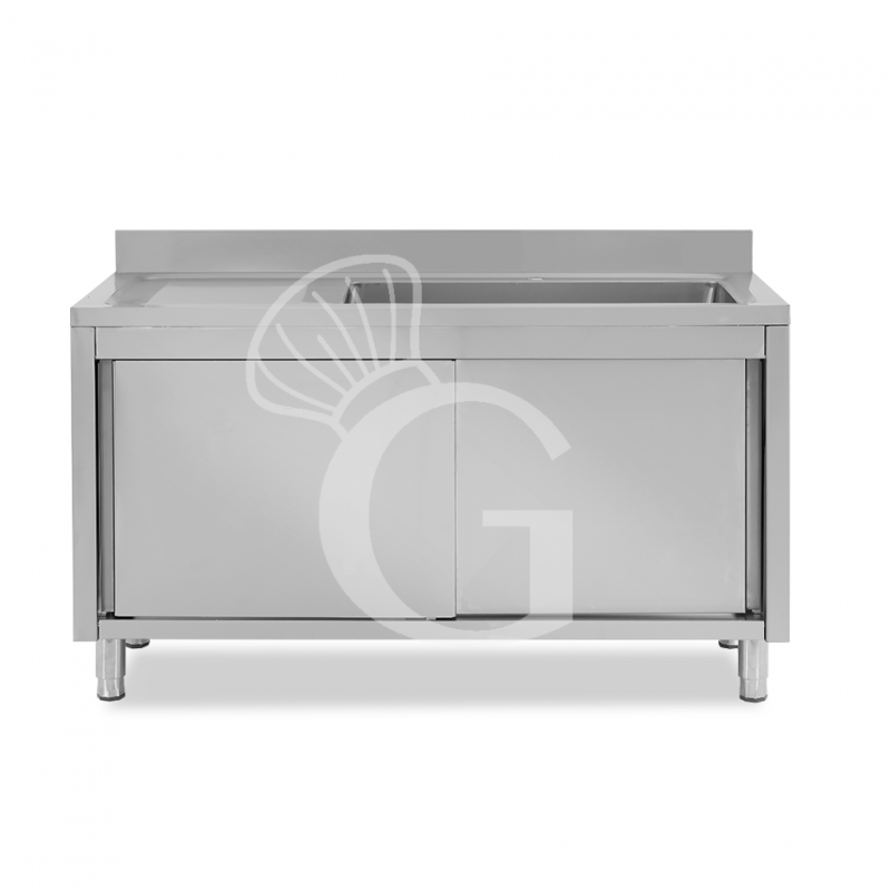 Spülschrank, Edelstahl, Schiebetüren, 1 Becken, Abtropffläche links, Aufkantung, B 1600 mm x T 600 mm x H 950 mm