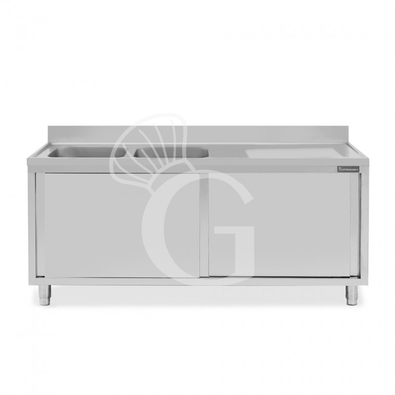 Der Spülschrank hat eine Aufkantung auf der Rückseite, 2 nahtlos eingeschweißte Becken und eine Abtropffläche auf der rechten Seite.