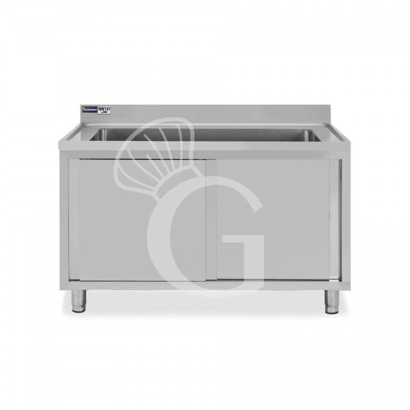 Topf-Spülschrank, Edelstahl, Schiebetüren, 1 Becken, Aufkantung, Hahnloch Ø 32 mm, B 1200 mm x T 700 mm x H 965 mm