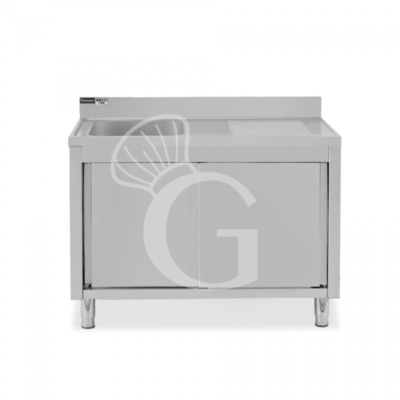 Spülschrank, Edelstahl, Schiebetüren, 1 Becken, Abtropffläche rechts, Aufkantung, Hahnloch Ø 32 mm, B 1200 x T 700 x H 965 mm