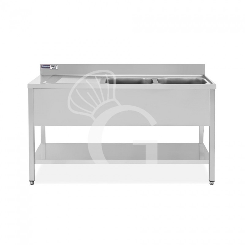 Der Spültisch hat eine Aufkantung auf der Rückseite, einen Grundboden, 2 nahtlos eingeschweißte Becken und eine Abtropffläche auf der linken Seite.