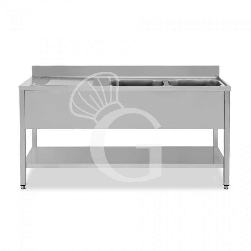 Der Spültisch hat eine Aufkantung auf der Rückseite, einen Grundboden, 2 nahtlos eingeschweißte Becken und eine Abtropffläche auf der linken Seite.