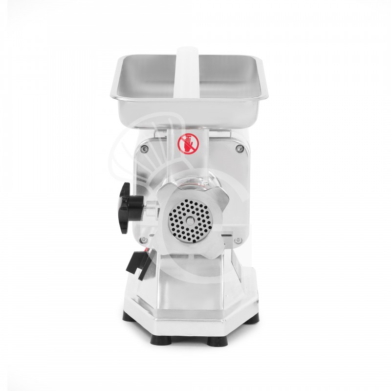 Il tritacarne ha una struttura in alluminio lucidato con tramoggia rotonda in acciaio inox.