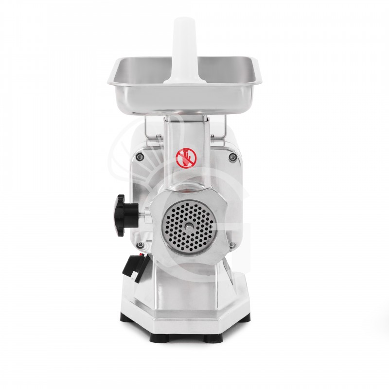 Il tritacarne ha una struttura in alluminio lucidato con tramoggia rotonda in acciaio inox.