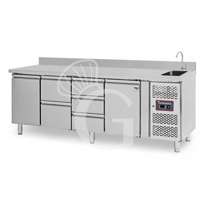 La refrigerazione è ventilata e ciò significa che il freddo viene prodotto da un evaporatore esterno ad alette trattato anticorrosione. Il tavolo ha anche un ricircolo di aria fredda. Il vano di produzione del freddo è infatti situato a destra e quindi, per distribuire il freddo equamente in tutta la larghezza del tavolo, è necessario che il freddo venga incanalato in un controsoffitto che ha delle apposite feritoie che permettono di distribuire uniformemente l' aria refrigerata in tutta la zona di stoccaggio.
