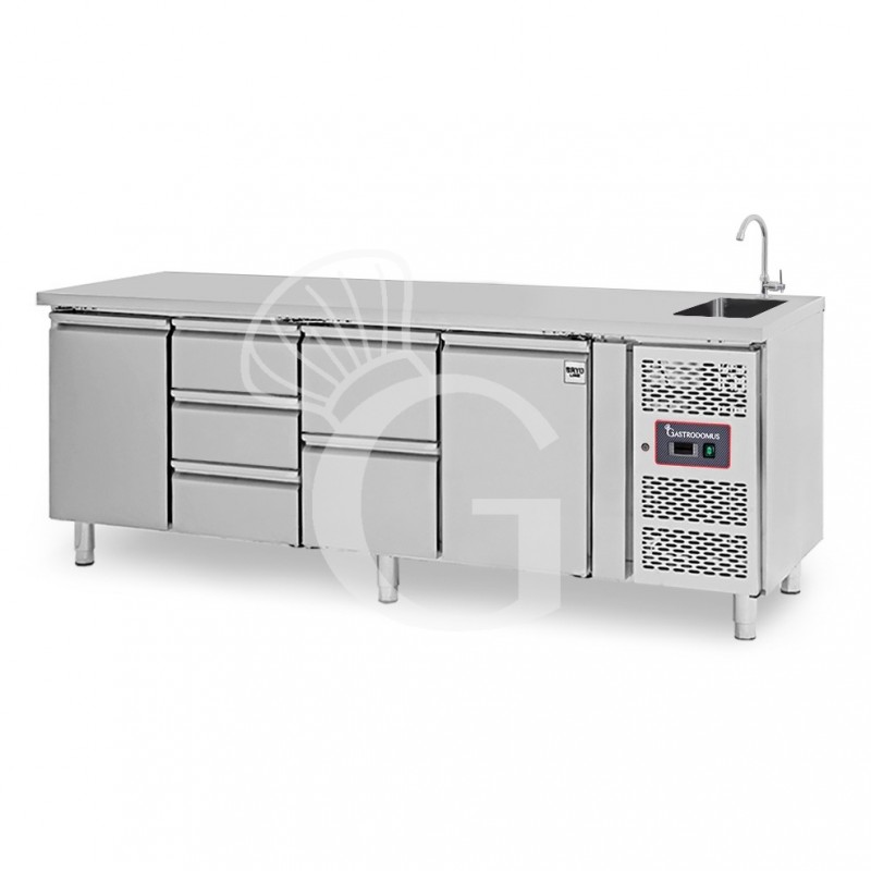 La refrigerazione è ventilata e ciò significa che il freddo viene prodotto da un evaporatore esterno ad alette trattato anticorrosione. Il tavolo ha anche un ricircolo di aria fredda. Il vano di produzione del freddo è infatti situato a destra e quindi, per distribuire il freddo equamente in tutta la larghezza del tavolo, è necessario che il freddo venga incanalato in un controsoffitto che ha delle apposite feritoie che permettono di distribuire uniformemente l' aria refrigerata in tutta la zona di stoccaggio.