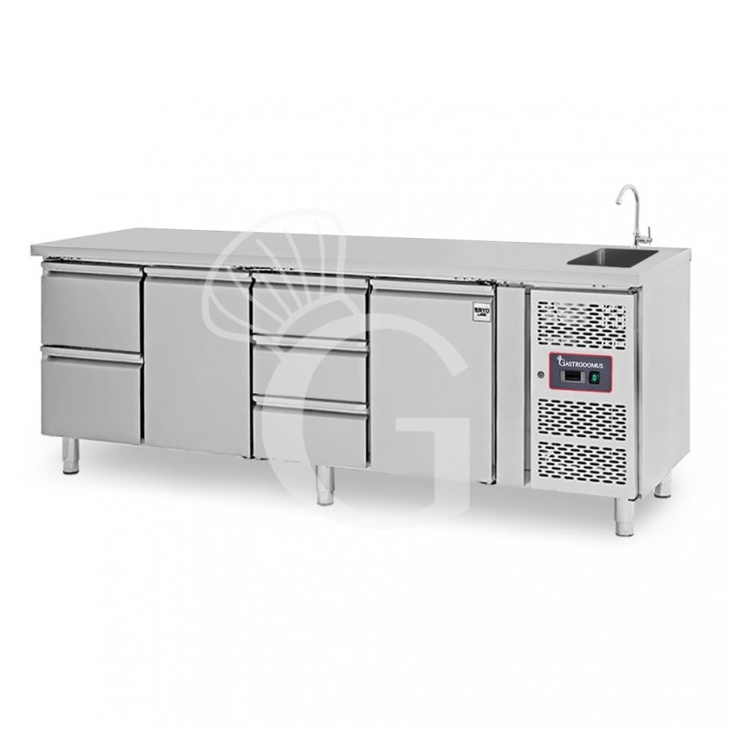 La refrigerazione è ventilata e ciò significa che il freddo viene prodotto da un evaporatore esterno ad alette trattato anticorrosione. Il tavolo ha anche un ricircolo di aria fredda. Il vano di produzione del freddo è infatti situato a destra e quindi, per distribuire il freddo equamente in tutta la larghezza del tavolo, è necessario che il freddo venga incanalato in un controsoffitto che ha delle apposite feritoie che permettono di distribuire uniformemente l' aria refrigerata in tutta la zona di stoccaggio.