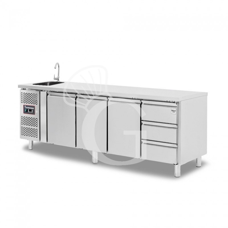 La refrigerazione è ventilata e ciò significa che il freddo viene prodotto da un evaporatore esterno ad alette trattato anticorrosione. Il tavolo ha anche un ricircolo di aria fredda. Il vano di produzione del freddo è infatti situato a destra e quindi, per distribuire il freddo equamente in tutta la larghezza del tavolo, è necessario che il freddo venga incanalato in un controsoffitto che ha delle apposite feritoie che permettono di distribuire uniformemente l' aria refrigerata in tutta la zona di stoccaggio.
