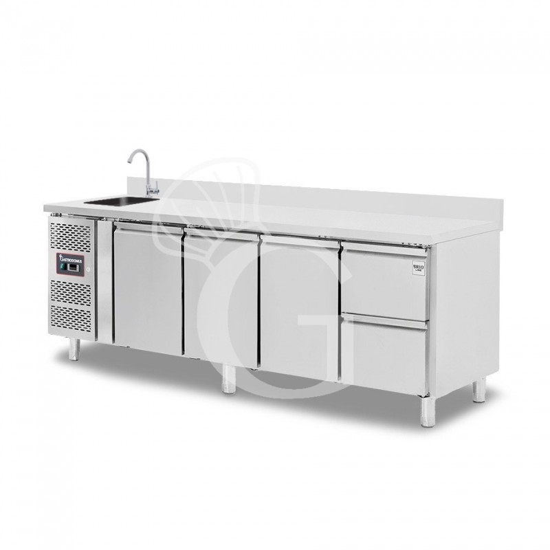 La refrigerazione è ventilata e ciò significa che il freddo viene prodotto da un evaporatore esterno ad alette trattato anticorrosione. Il tavolo ha anche un ricircolo di aria fredda. Il vano di produzione del freddo è infatti situato a destra e quindi, per distribuire il freddo equamente in tutta la larghezza del tavolo, è necessario che il freddo venga incanalato in un controsoffitto che ha delle apposite feritoie che permettono di distribuire uniformemente l' aria refrigerata in tutta la zona di stoccaggio.