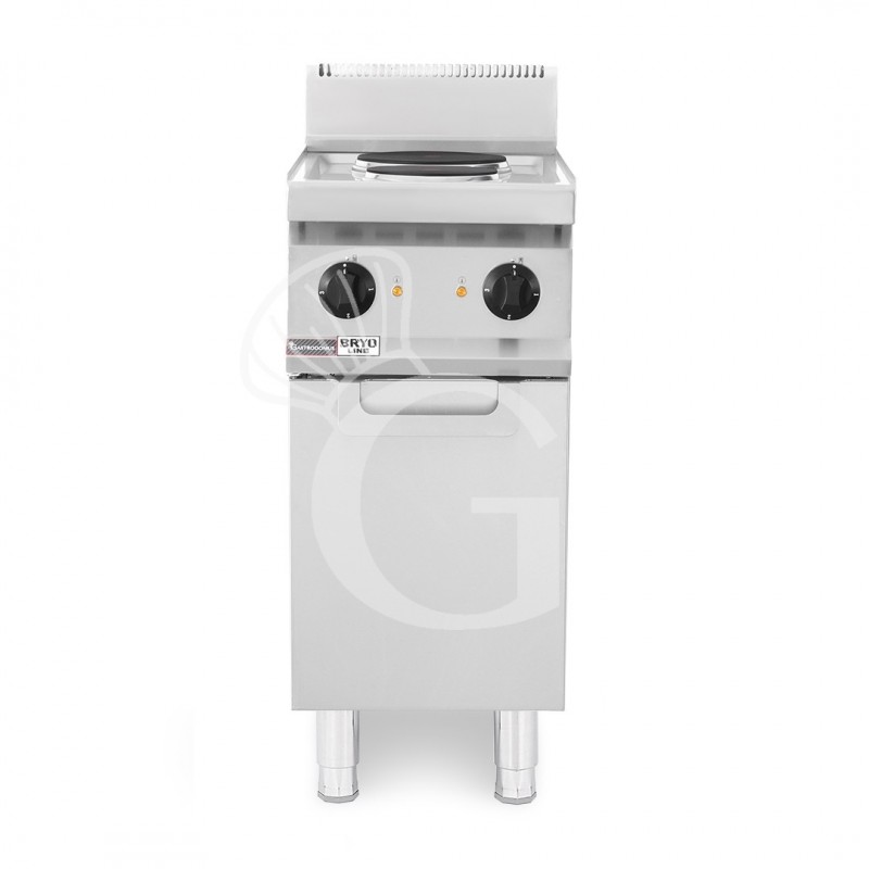 Il piano di cottura è dotato di 2 piastre elettriche in ghisa tonde fissate ermeticamente al piano che hanno diametro 22 cm e potenza di 2,4 KW ognuna. Le piastre hanno inoltre bordo in acciaio INOX a tenuta e ogni piastra presenta un commutatore con 6 possibilità di regolazione della temperatura di lavoro.