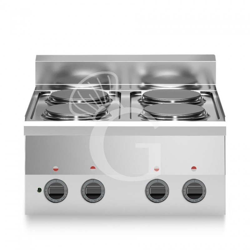 Das Kochfeld besteht aus 4 hermetisch fixierte Elektroplatten aus Gusseisen, die einen Durchmesser von 180 mm und eine Leistung von je 1,5 kW haben. Die Platten haben einen Dichtungsrand aus Edelstahl. Jede Platte besitzt einen Regler mit 7- Taktschaltung mit denen der Benützer zwischen 6 verschiedenen Leistungsstufen wählen kann.