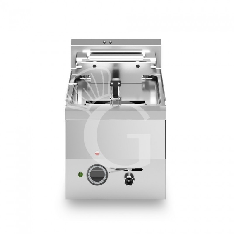 Die Oberplatte und das Frittierbecken des Gerätes bestehen aus Edelstahl AISI304, Stärke 10/10. Der auf der Bedienblende befindliche Fettablasshahn sorgt für ein sicheres Ablassen von Frittieröl oder Stangenfett.