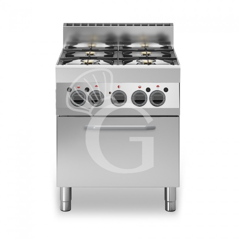 Professioneller Gasherd mit 4 Brenner und Elektrobackofen mit Umluft, Tiefe 650 mm
