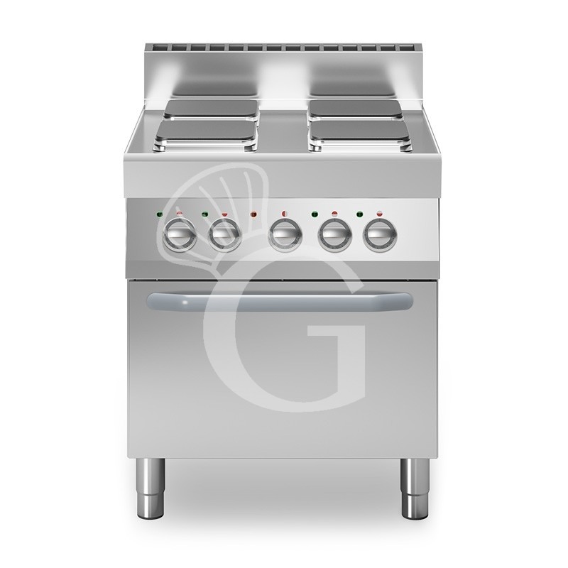 Professioneller Elektroherd mit 4 quadratischen Kochplatten und Elektrobackofen mit Umluft GN1/1, Tiefe 700 mm