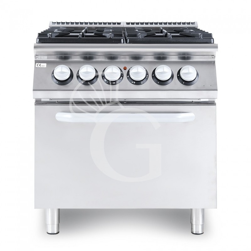 Professioneller Gasherd mit 4 Brenner und Elektrobackofen mit Umluft, Tiefe 900 mm
