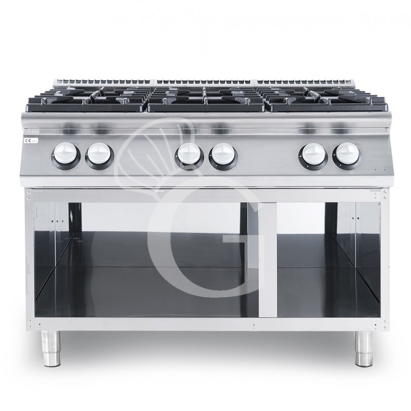 Professioneller Gasherd mit 6 Brenner und offenen Unterbau mit 2 Fächer, Tiefe 900 mm