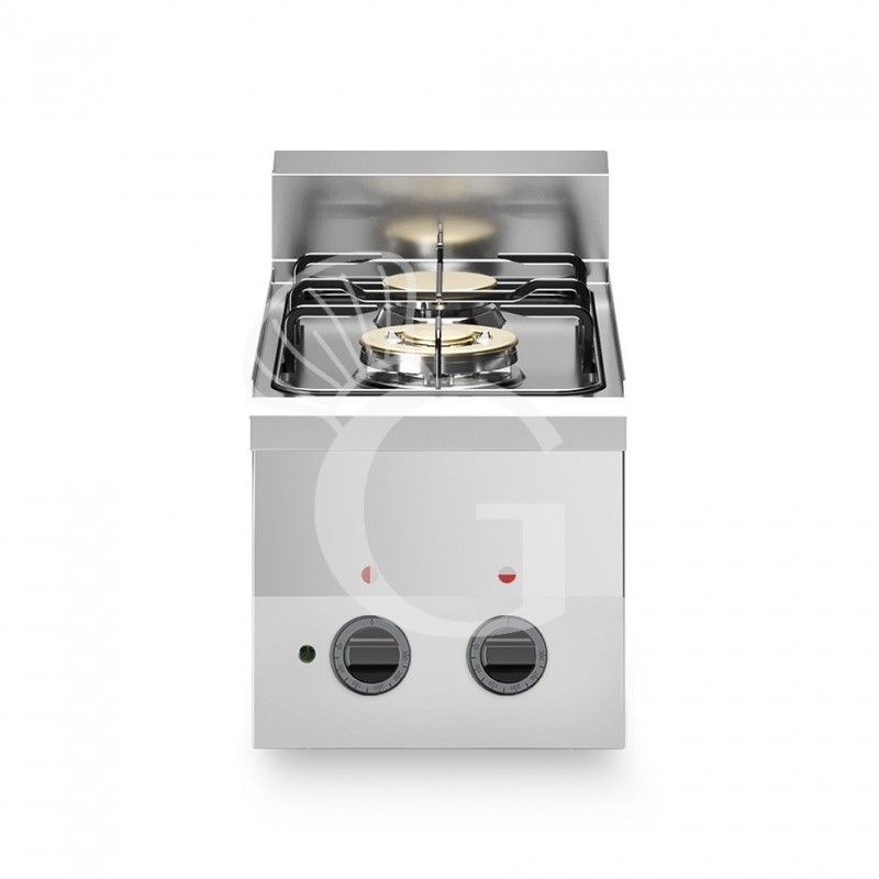 Die Gaszufuhr erfolgt durch Gashähne mit Vollzündsicherung mittels Thermoelement. Piezozündung. Das Kochfeld verfügt über einen Einzelkranzbrenner (2,8 kw) und einen Dreikranzbrenner (3,3 kw).