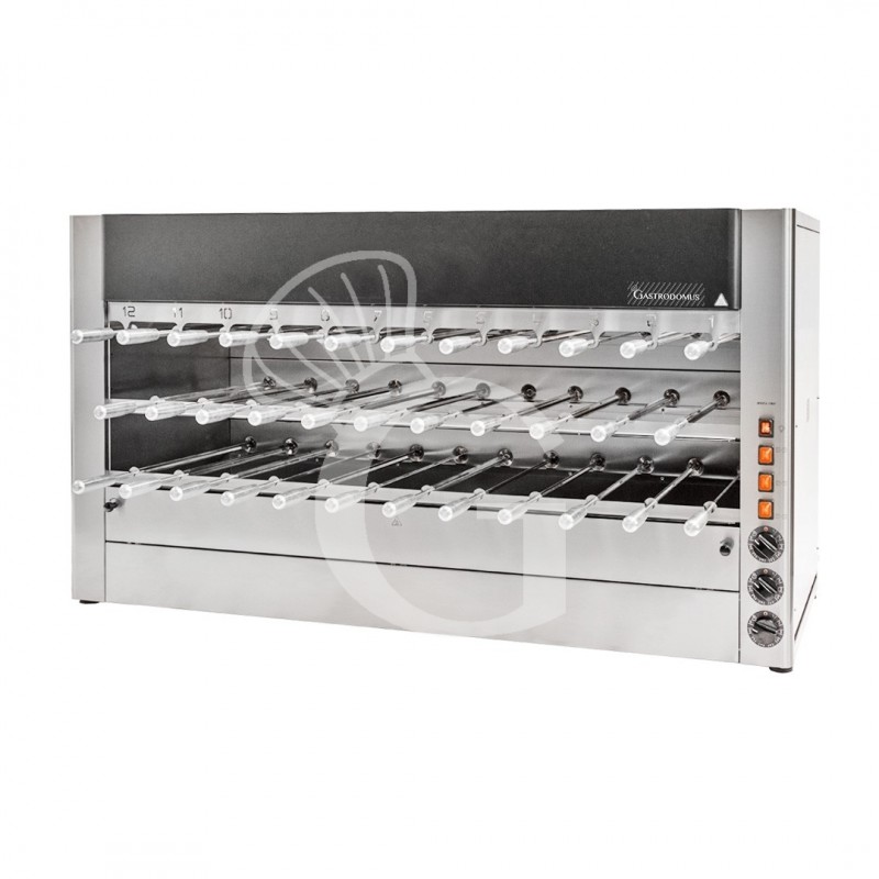 Er besitzt 2 Mehrgasbrenner, ein Sicherheitsventil im oberen Teil der Maschine, 35 unabhängige Antriebsmotore für jedes Grillschwert, 35 Grillschwerter die sich in 3 Reihen (2 zum Grillen und 1 zum Warmhalten) drehen, eine Innenbeleuchtung und ein entfernbares Becken aus Edelstahl.