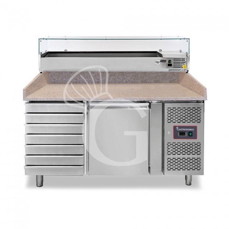 Pizzakühltisch, 1 Tür, 7 Schubladen, 210 L, Gitter 600 x 400 mm, mit Kühlaufsatzvitrine für 7 Behälter GN1/4