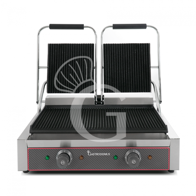 Doppel Kontaktgrill, gerillte Grillplatte aus Gusseisen, B 570 mm x T 380 mm x H 210/520 mm