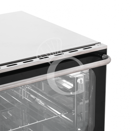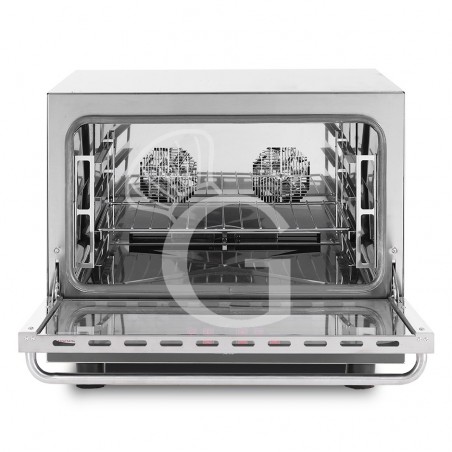 Der Heißluftofen aus Edelstahl besitzt eine Klapptür mit einem praktischen Griff und herausnehmbare Einschubgestelle. Er ist für 4 Backbleche (530x325 mm) geeignet.