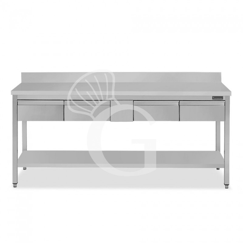 Einfacher Edelstahltisch mit Grundboden, Aufsatz und 4 Schubladen und Breite 1800 mm x Tiefe 600 mm x Höhe 950 mm.