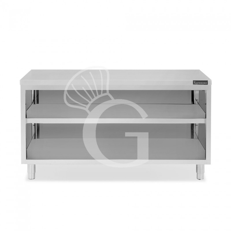 Offener Edelstahltisch mit 2 Regalböden und Breite 1800 mm x Tiefe 600 mm x Höhe 850 mm.