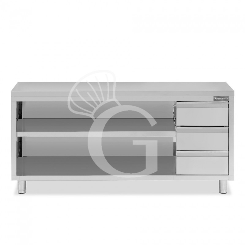 Offener Edelstahltisch mit 3 Schubladen auf der rechten Seite B 2300 mm x T 600 mm x H 850 mm