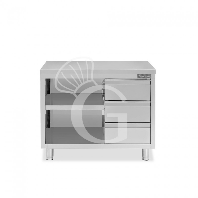 Offener Edelstahltisch mit 3 Schubladen auf der rechten Seite, Länge 1000 mm x Tiefe 700 mm x Höhe 850 mm.