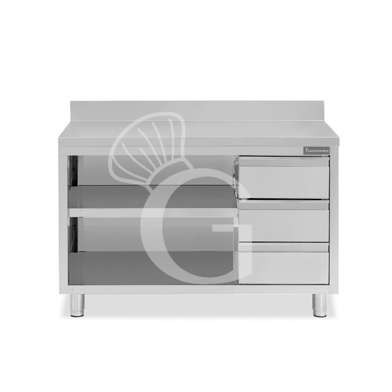 Offener Edelstahltisch mit 3 Schubladen auf der rechten Seite und Aufsatz, Länge 1600 mm x Tiefe 600 mm x Höhe 950 mm.