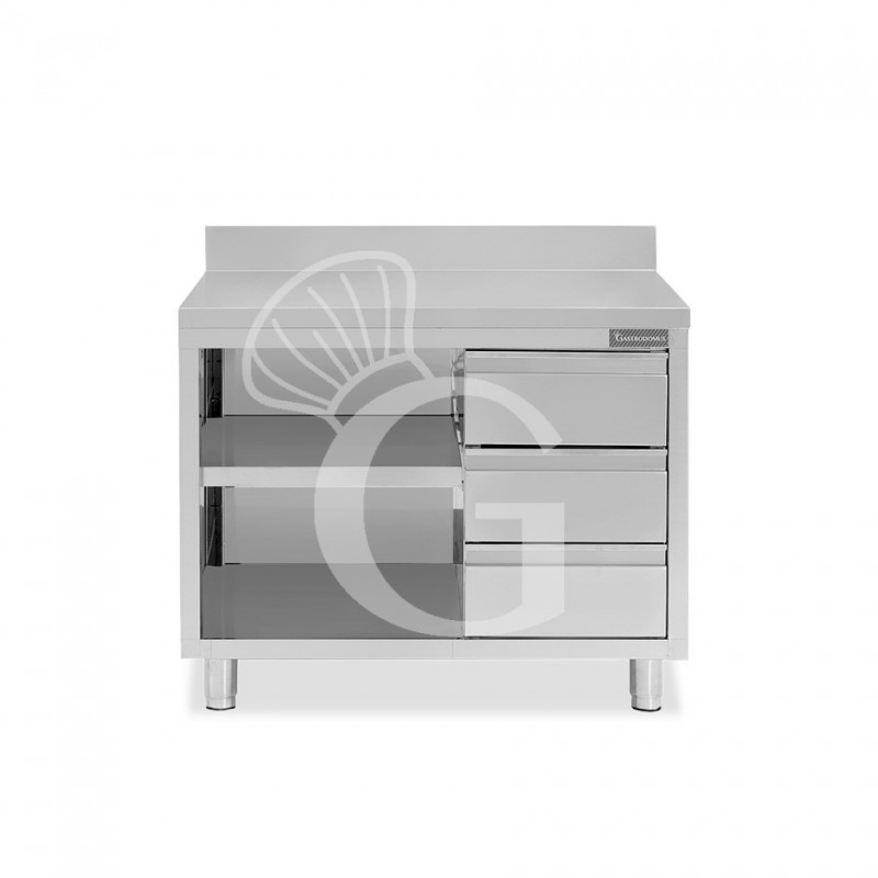 Offener Edelstahltisch mit 3 Schubladen rechts und Aufsatz B 1000 mm x T 700 mm x H 950 mm