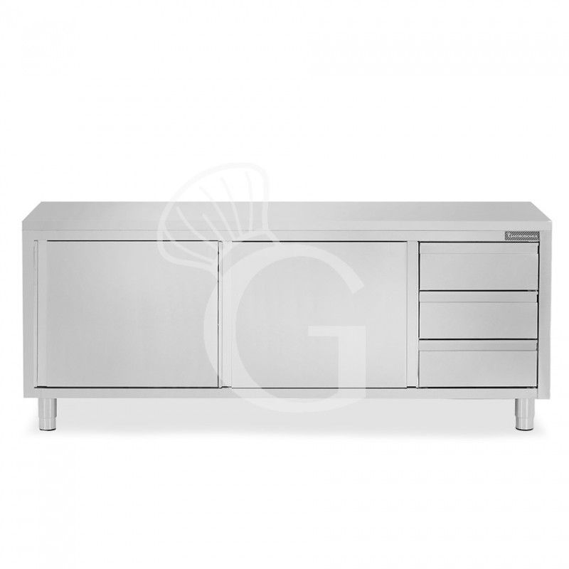 Schranktisch aus Edelstahl mit 2 Schiebetüren, 3 Schubladen auf der rechten Seite und Breite 2300 mm x Tiefe 600 mm x Höhe 850 mm.