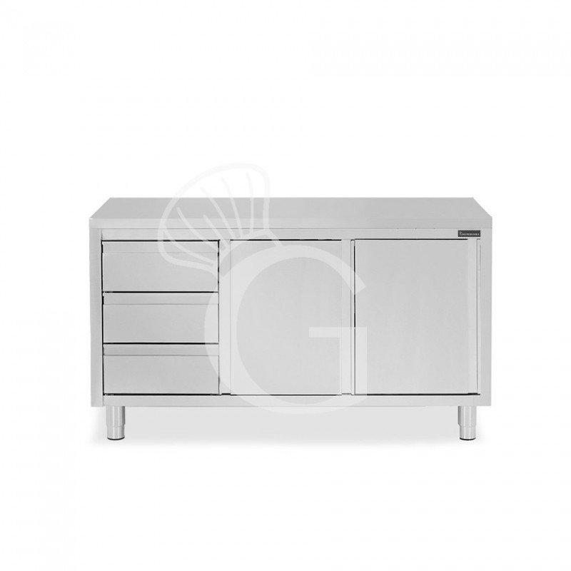 Schranktisch aus Edelstahl mit 2 Schiebetüren, 3 Schubladen auf der linken Seite und Breite 1700 mm x Tiefe 600 mm x Höhe 850 mm.