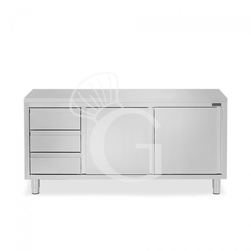 Schranktisch aus Edelstahl mit 2 Schiebetüren, 3 Schubladen auf der linken Seite und Breite 2100 mm x Tiefe 600 mm x Höhe 850 mm.