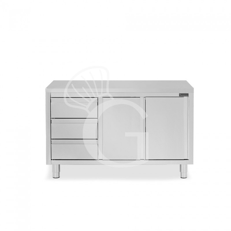 Schranktisch aus Edelstahl mit 2 Schiebetüren, 3 Schubladen auf der linken Seite und Breite 1400 mm x Tiefe 700 mm x Höhe 850 mm.