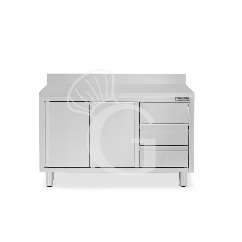 Schranktisch aus Edelstahl mit 2 Schiebetüren, 3 Schubladen auf der rechten Seite, Aufsatz und Breite 1600 mm x Tiefe 600 mm x Höhe 950 mm.