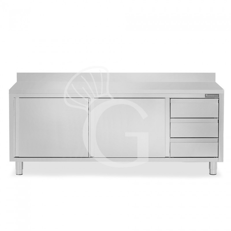 Schranktisch aus Edelstahl mit 2 Schiebetüren, 3 Schubladen auf der rechten Seite, Aufsatz und Breite 2400 mm x Tiefe 600 mm x Höhe 950 mm.