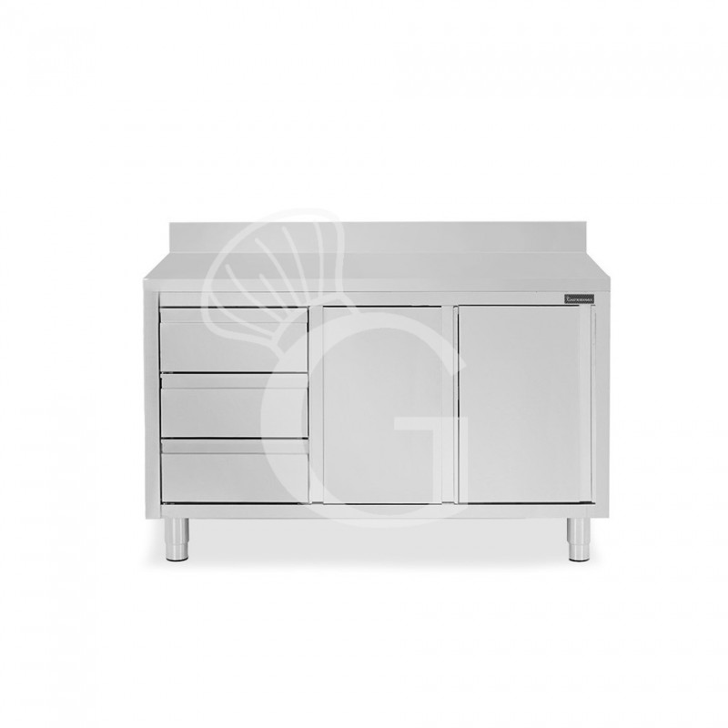 Schranktisch aus Edelstahl mit 2 Schiebetüren, 3 Schubladen auf der linken Seite, Aufsatz und Breite 1600 mm x Tiefe 600 mm x Höhe 950 mm.