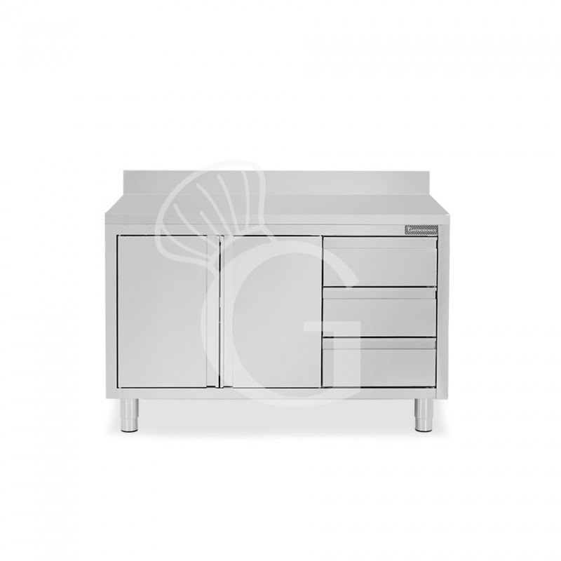Schranktisch aus Edelstahl mit 2 Flügeltüren, 3 Schubladen auf der rechten Seite, Aufsatz und Breite 1200 mm x Tiefe 700 mm x Höhe 950 mm.