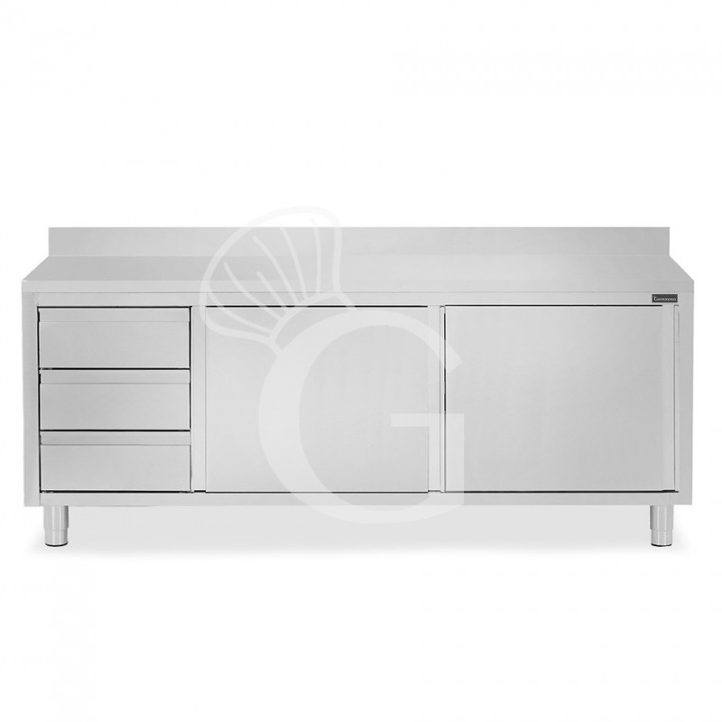 Schranktisch aus Edelstahl mit 2 Schiebetüren, 3 Schubladen auf der linken Seite, Aufsatz und Breite 2300 mm x Tiefe 700 mm x Höhe 950 mm.