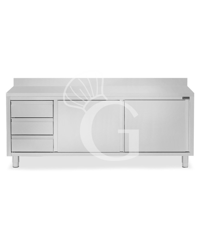 Schranktisch aus Edelstahl mit 2 Schiebetüren, 3 Schubladen auf der linken Seite, Aufsatz und Breite 2400 mm x Tiefe 700 mm x Höhe 950 mm.